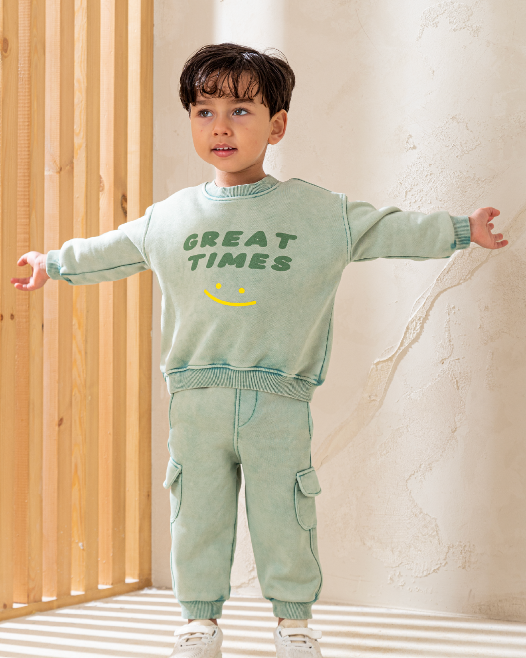 Introducing our latest addition to the NB baby collection - the Great Times pajama set for boys! Made with soft and comfortable fabric, these pajamas come in shades of green, ashen, and blessed. Available in sizes 6 months to 18 months, these adorable pajamas are perfect for your little one to dream and play in. Get yours today and let your baby sleep in style and comfort.