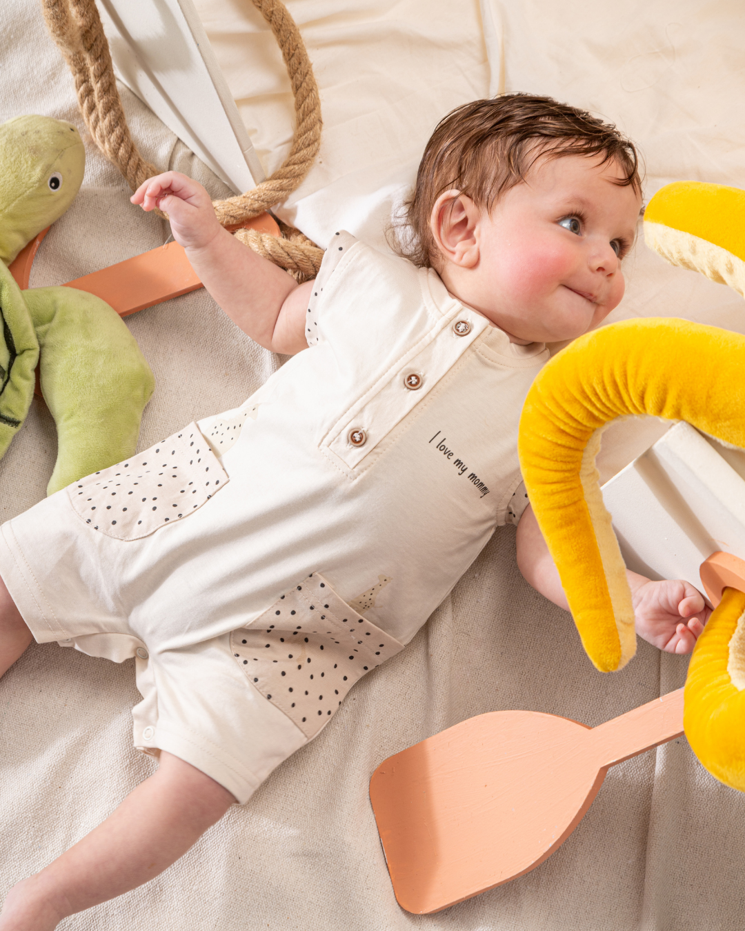 Dress your little one in the cutest and comfiest overalls with our "I Love My Mommy" design. Made from 100% cotton jersey fabric, these overalls are soft and gentle on your baby's delicate skin. Available in a charming beige color, they come in sizes perfect for 3, 6, 9, and 12-month-old babies. Perfect for everyday wear or special occasions, these overalls will make your baby look adorable while showing off their love for mommy.