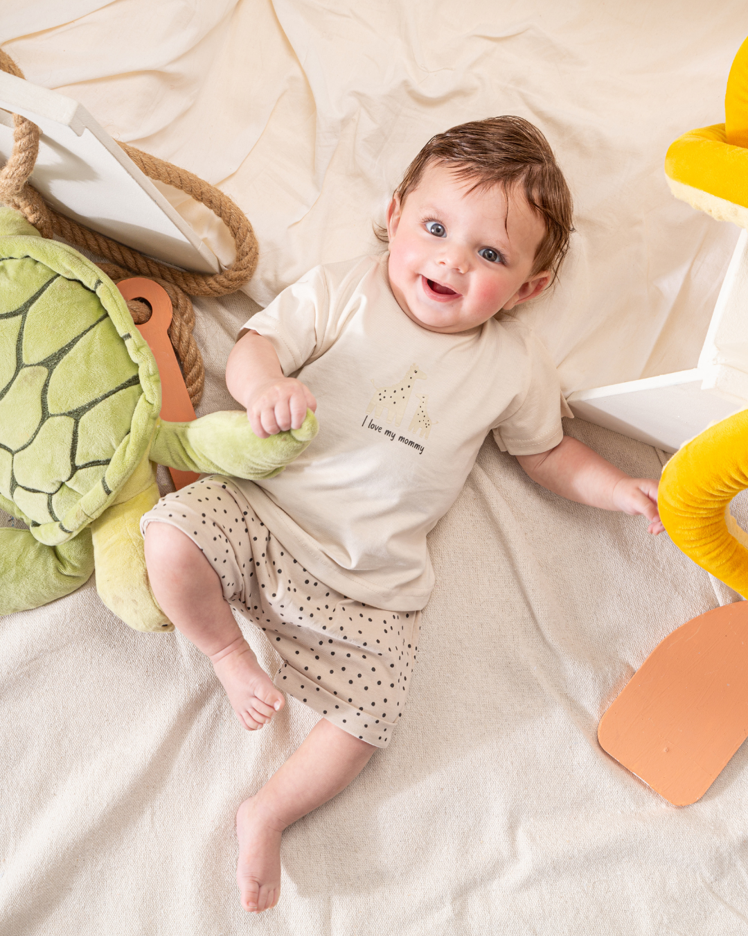 Treat your little one to the ultimate comfort with our I Love My Mommy Baby Pajamas. These adorable pajamas feature half sleeves and shorts, perfect for warmer nights. Available in a beautiful beige color, these pajamas are made from 100% cotton jersey material, ensuring softness and coziness for your baby. Available in sizes 3 months to 12 months, it's the perfect addition to your baby's sleepwear collection.