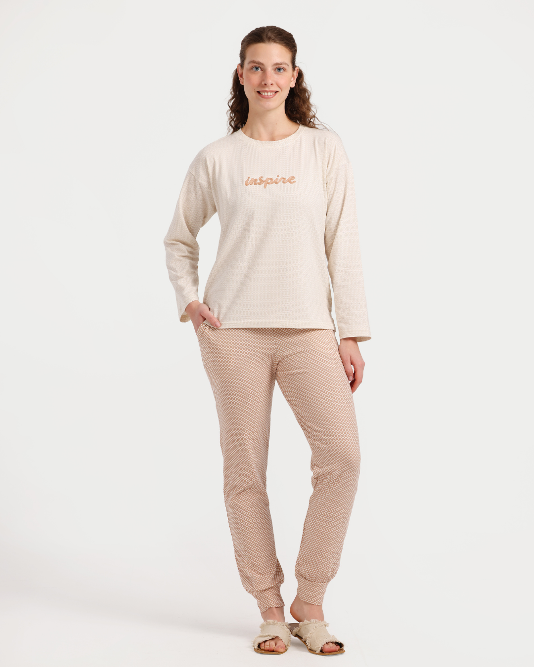 قم بترقية مجموعة ملابس النوم الخاصة بك مع بيجامات Inspire النسائية. تتضمن هذه المجموعة بنطالًا مريحًا وقميصًا أنيقًا، مما يجعلها مثالية لقضاء ليلة مريحة. تتوفر هذه البيجامات باللون البيج الجميل، وتأتي في مجموعة من المقاسات من S إلى 2XL. مصنوعة من مادة قطن ليكرا باراسولا عالية الجودة، هذه البيجامات ستبقيك مرتاحًا وأنيقًا طوال الليل.